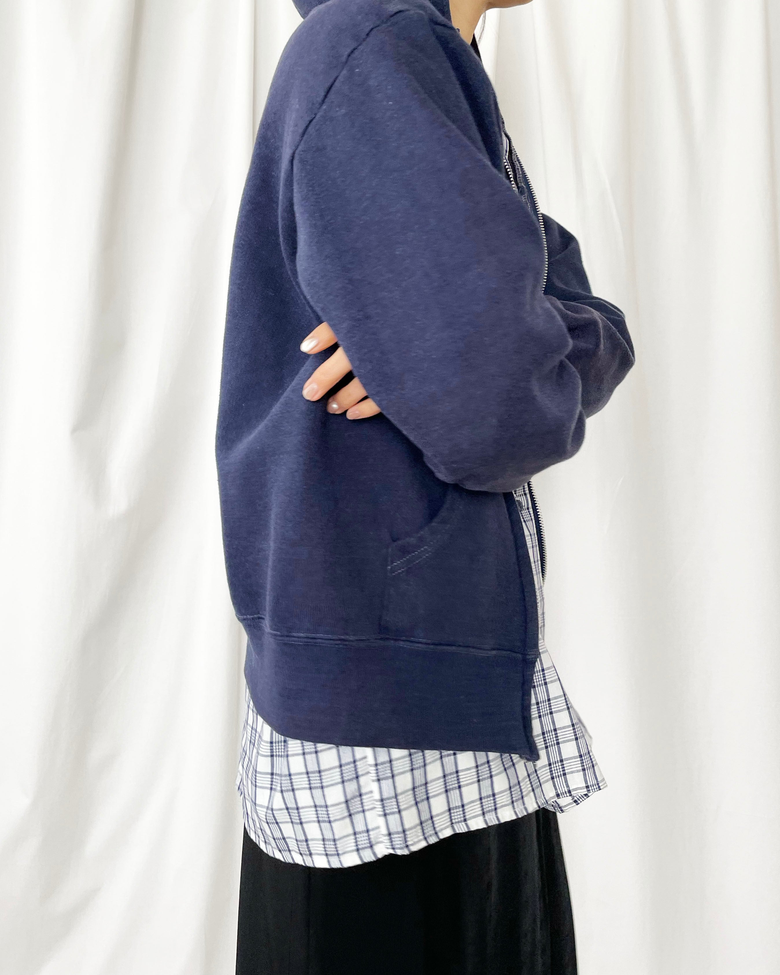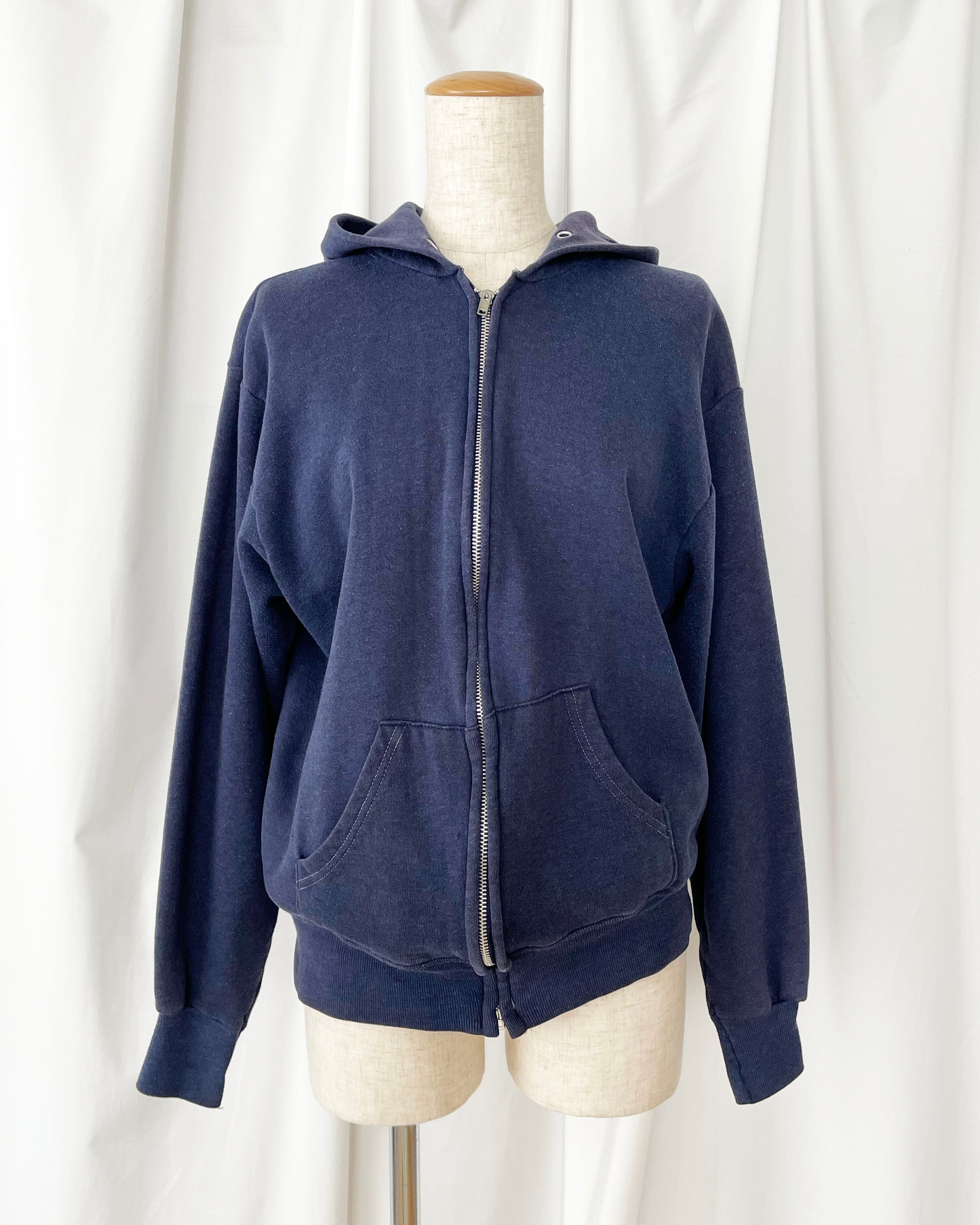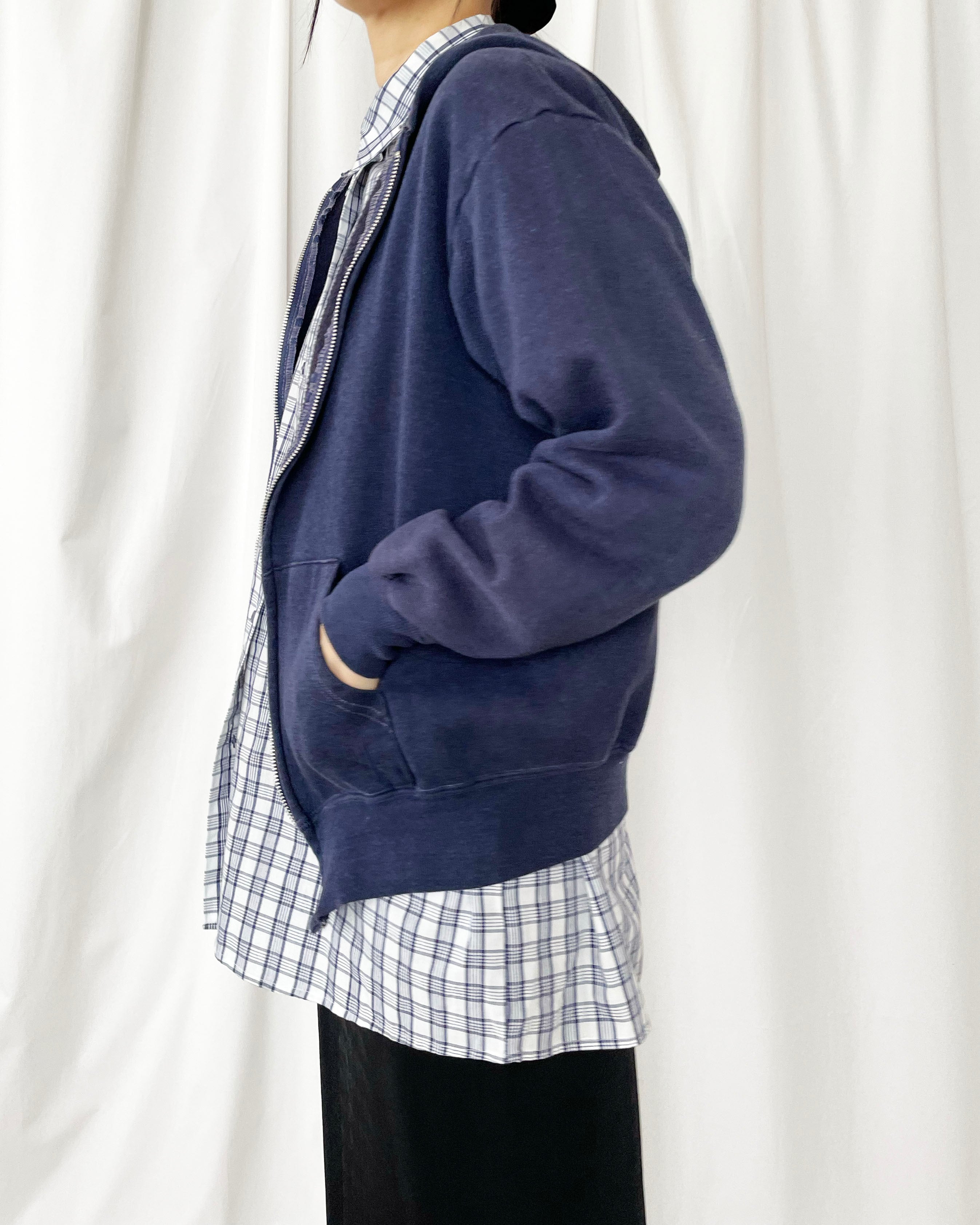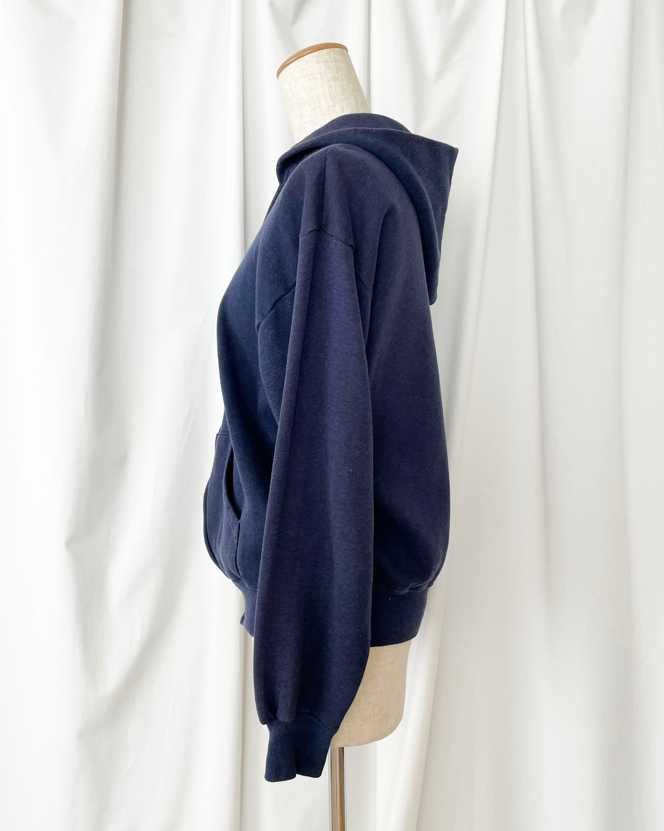 ネイビーカラー、シンプルな裏起毛ジップパーカ。