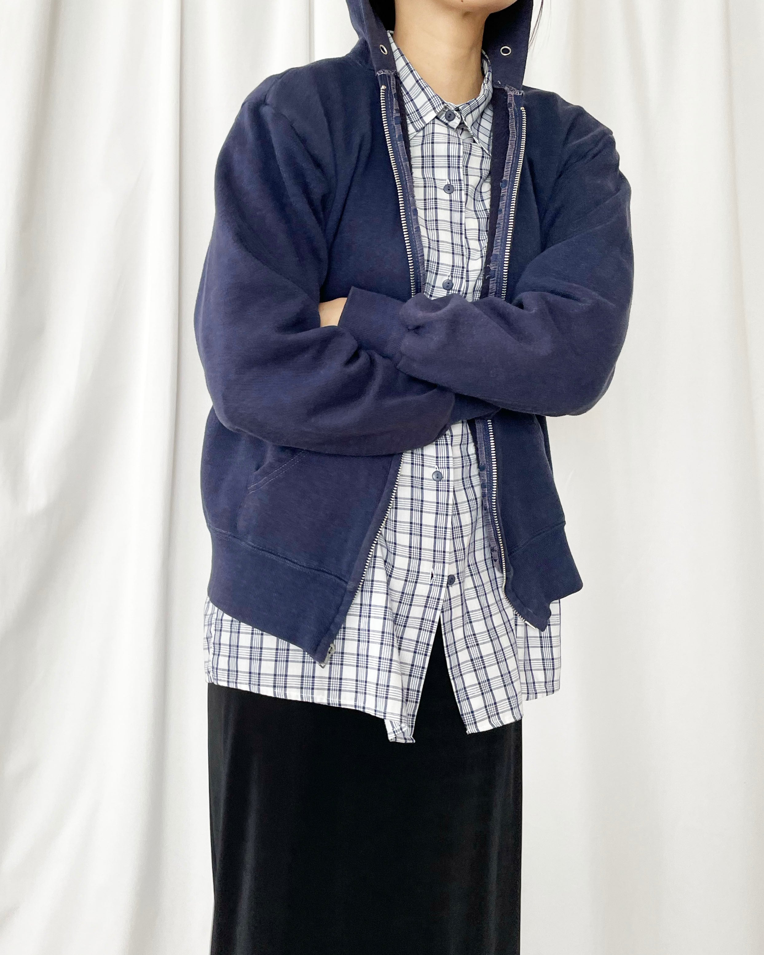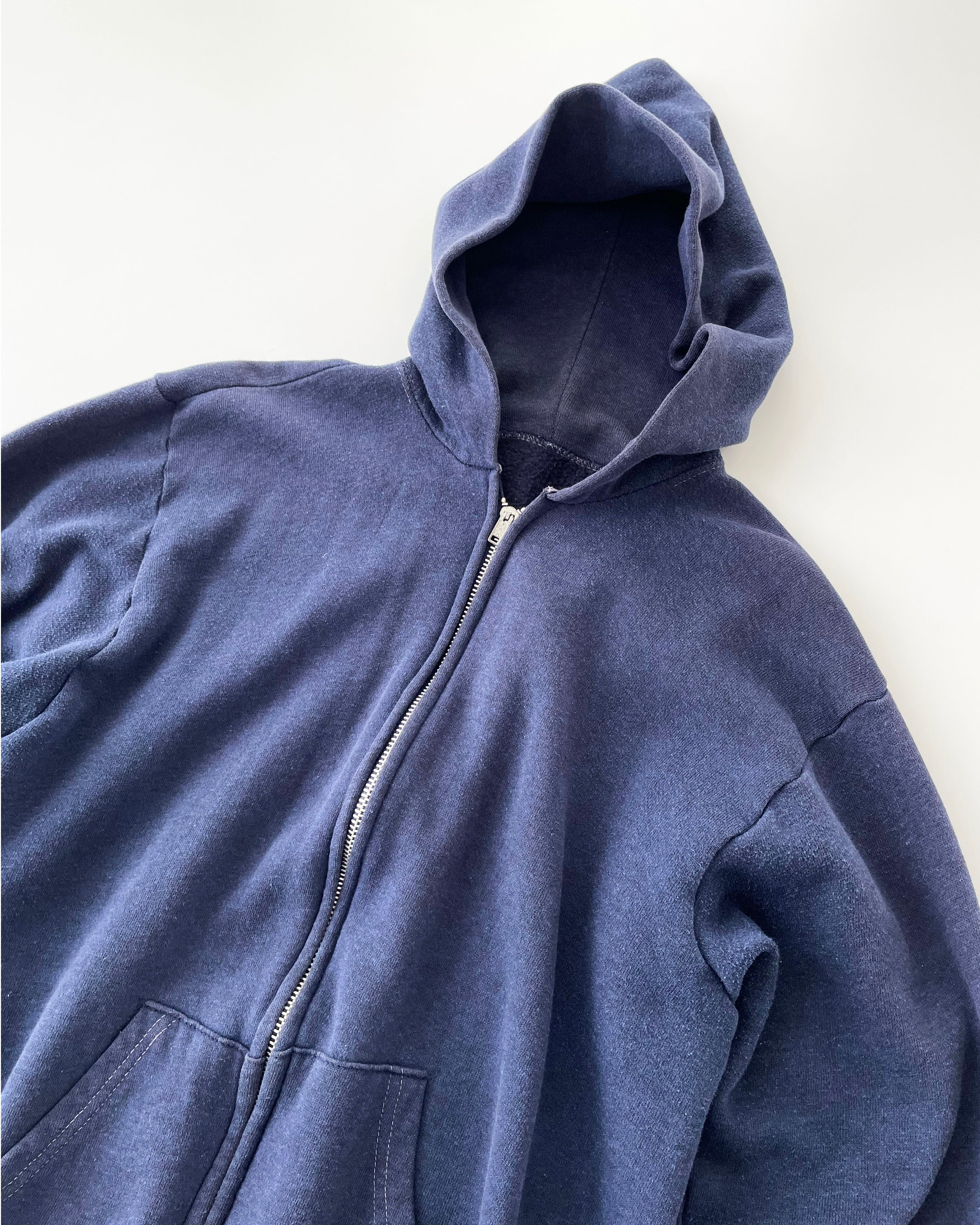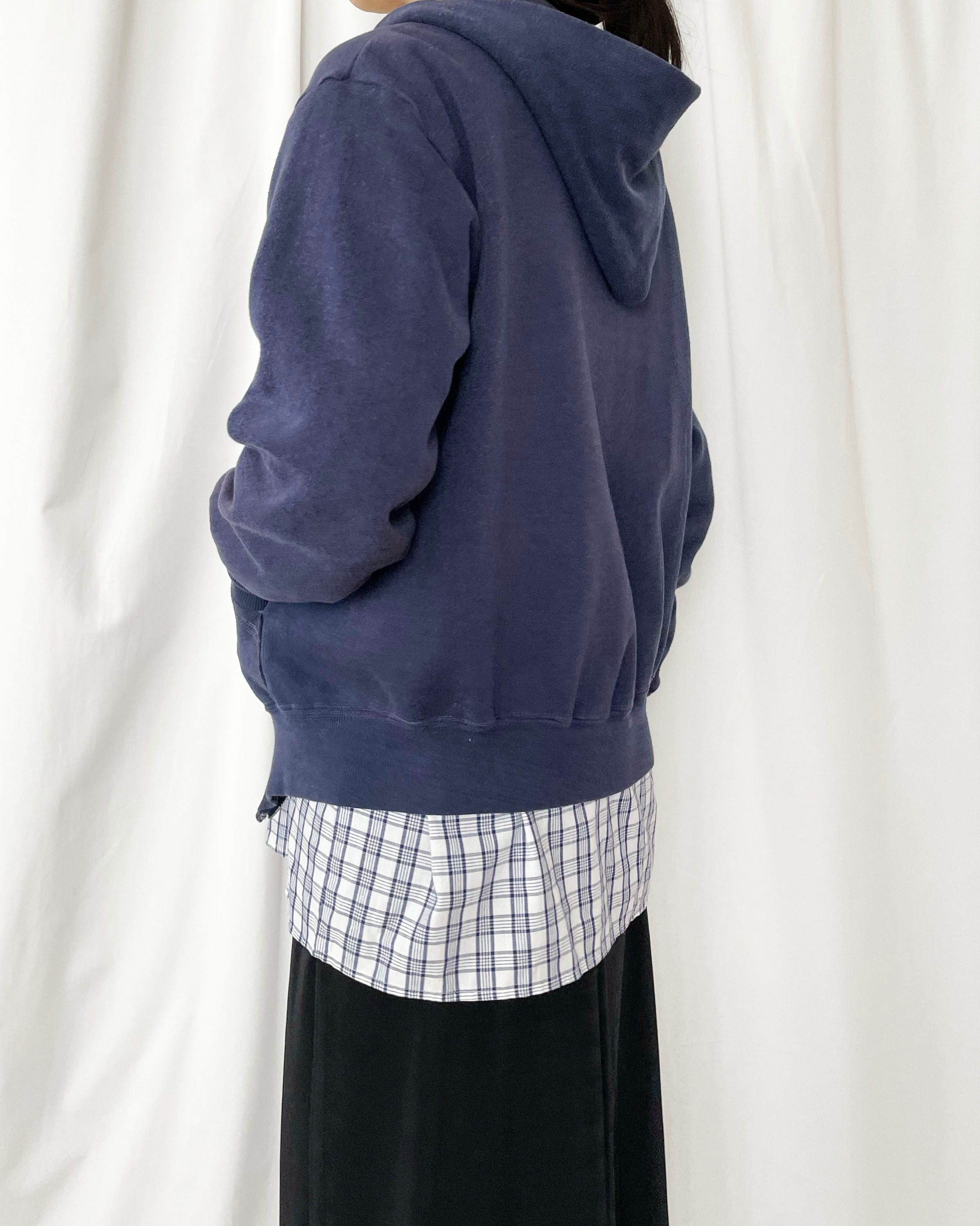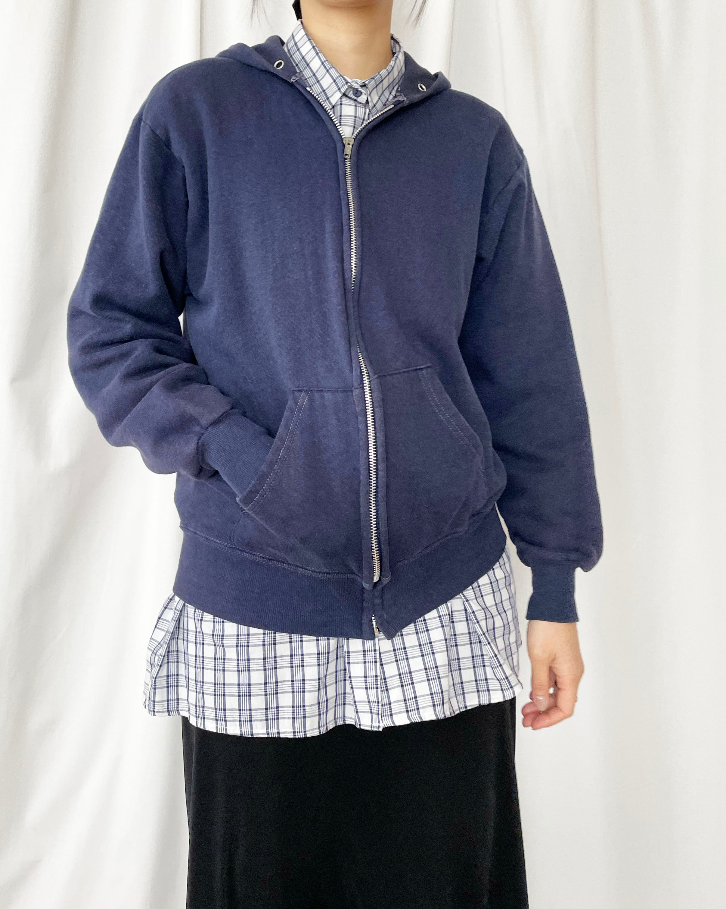 ネイビーカラー、シンプルな裏起毛ジップパーカ。
