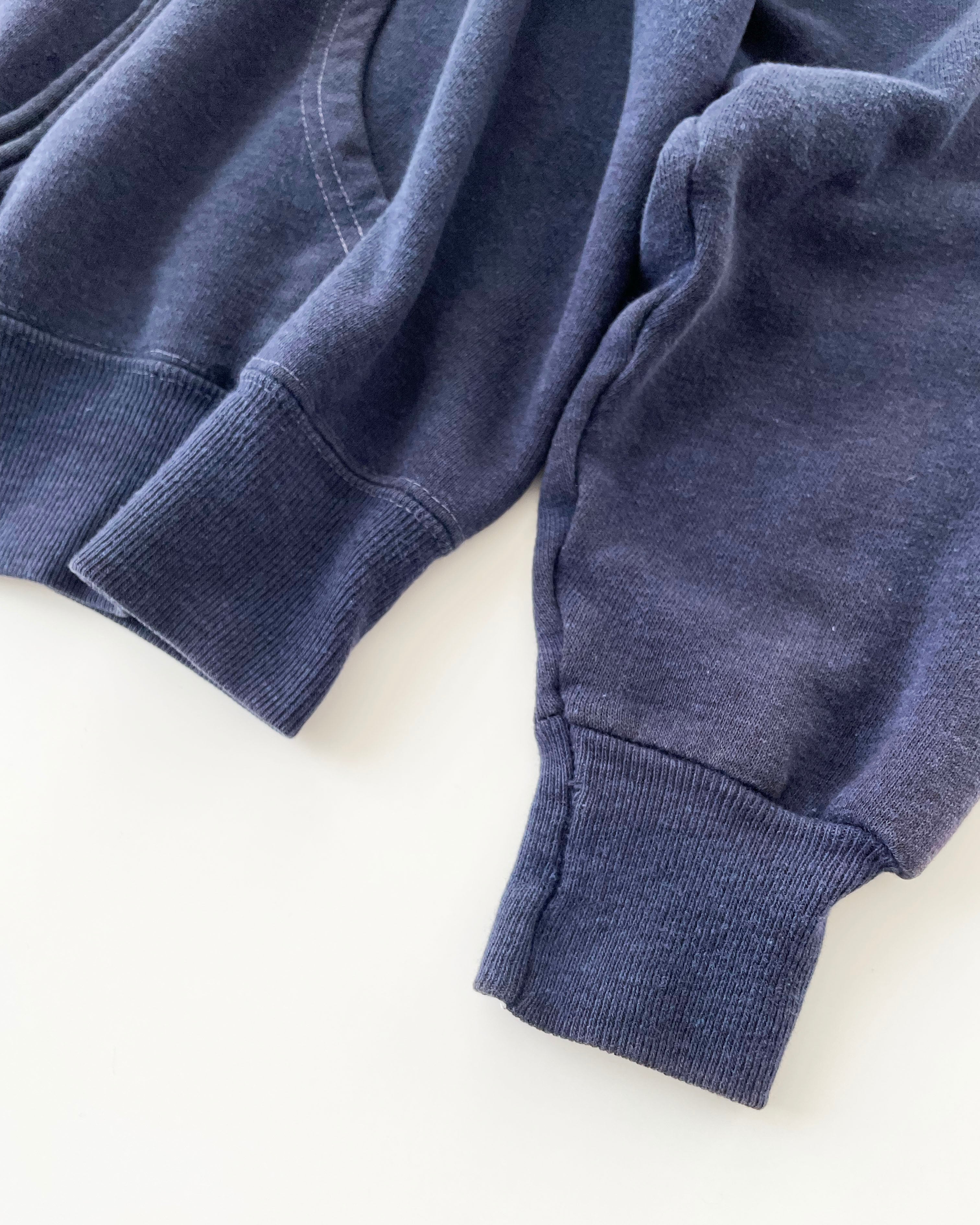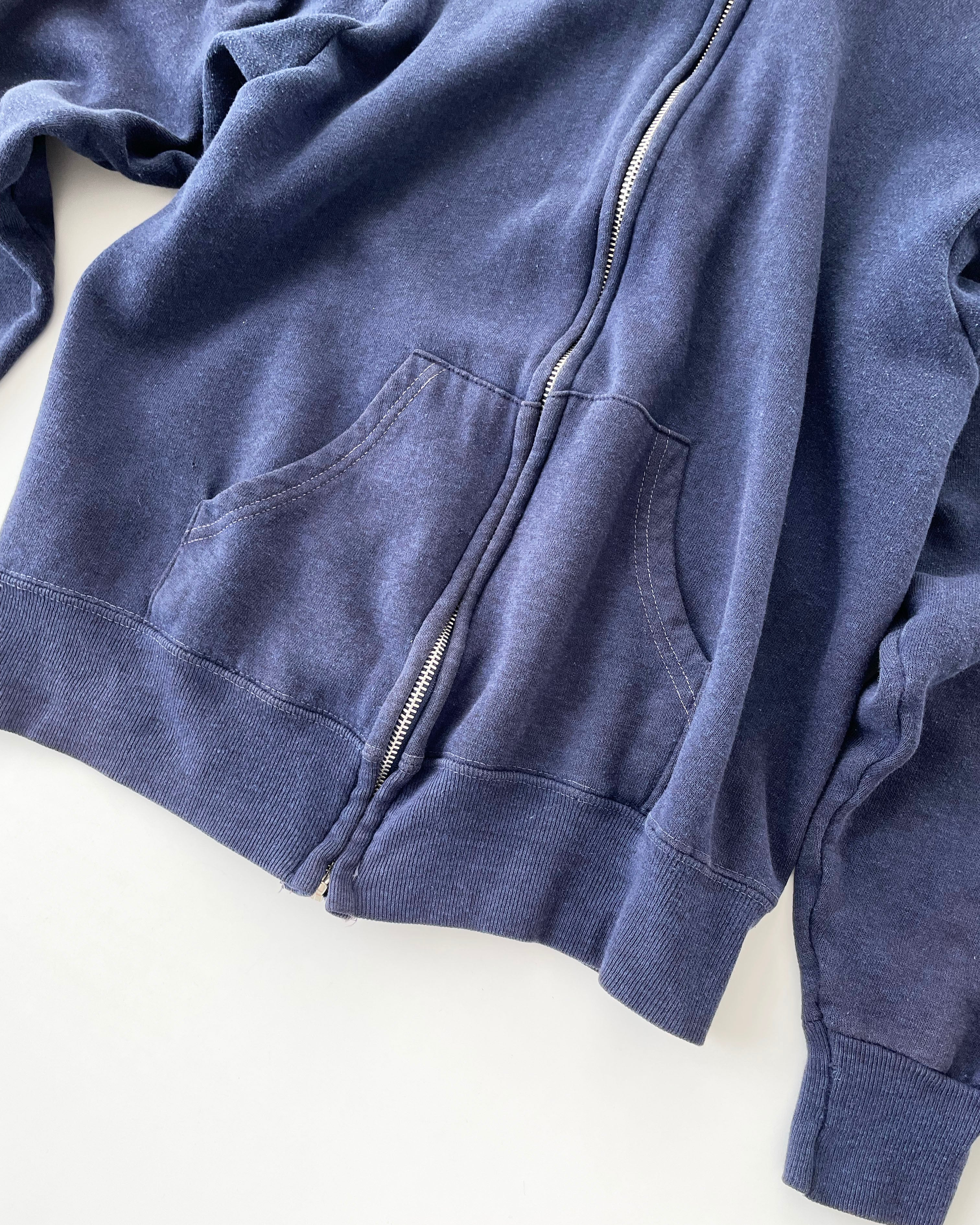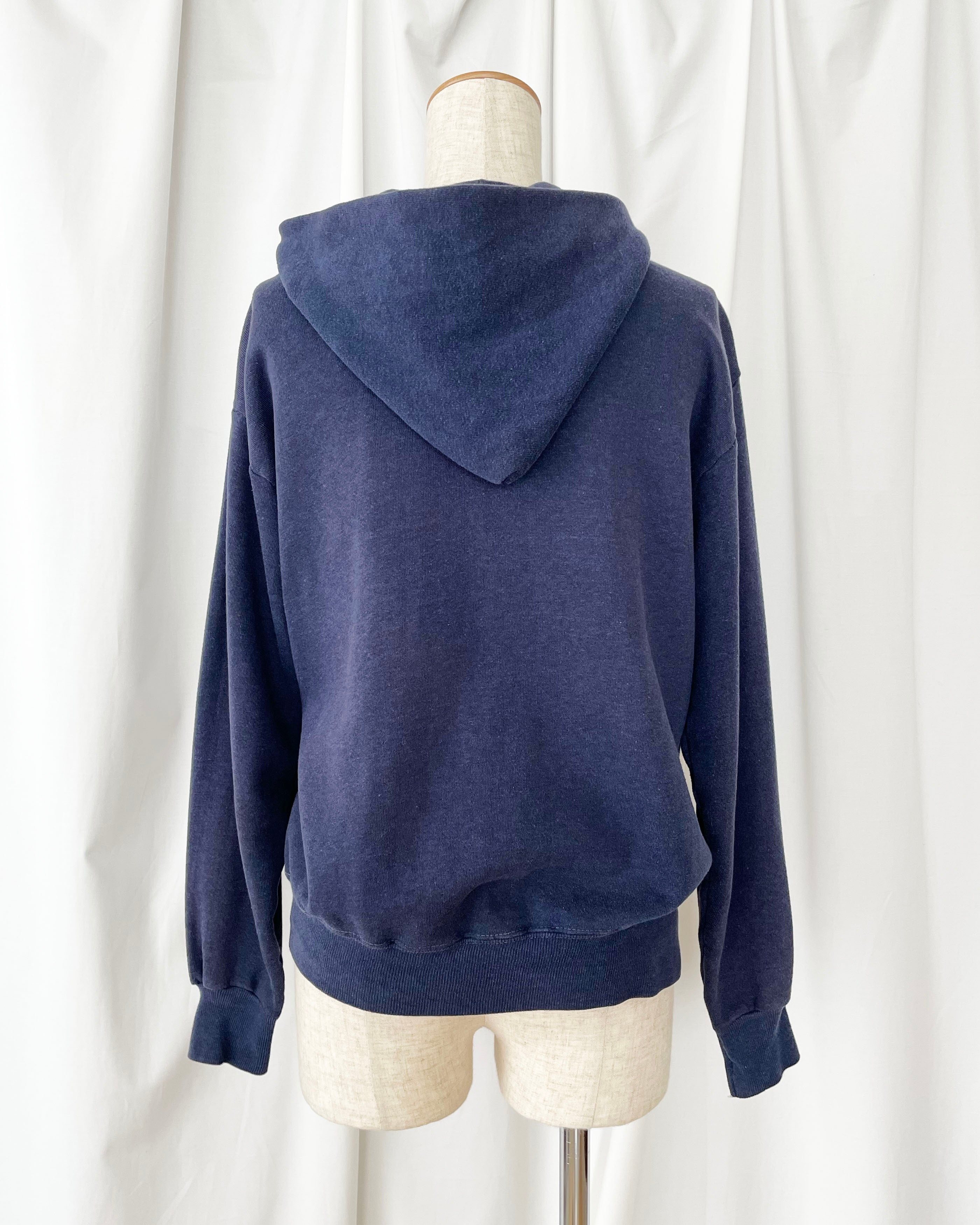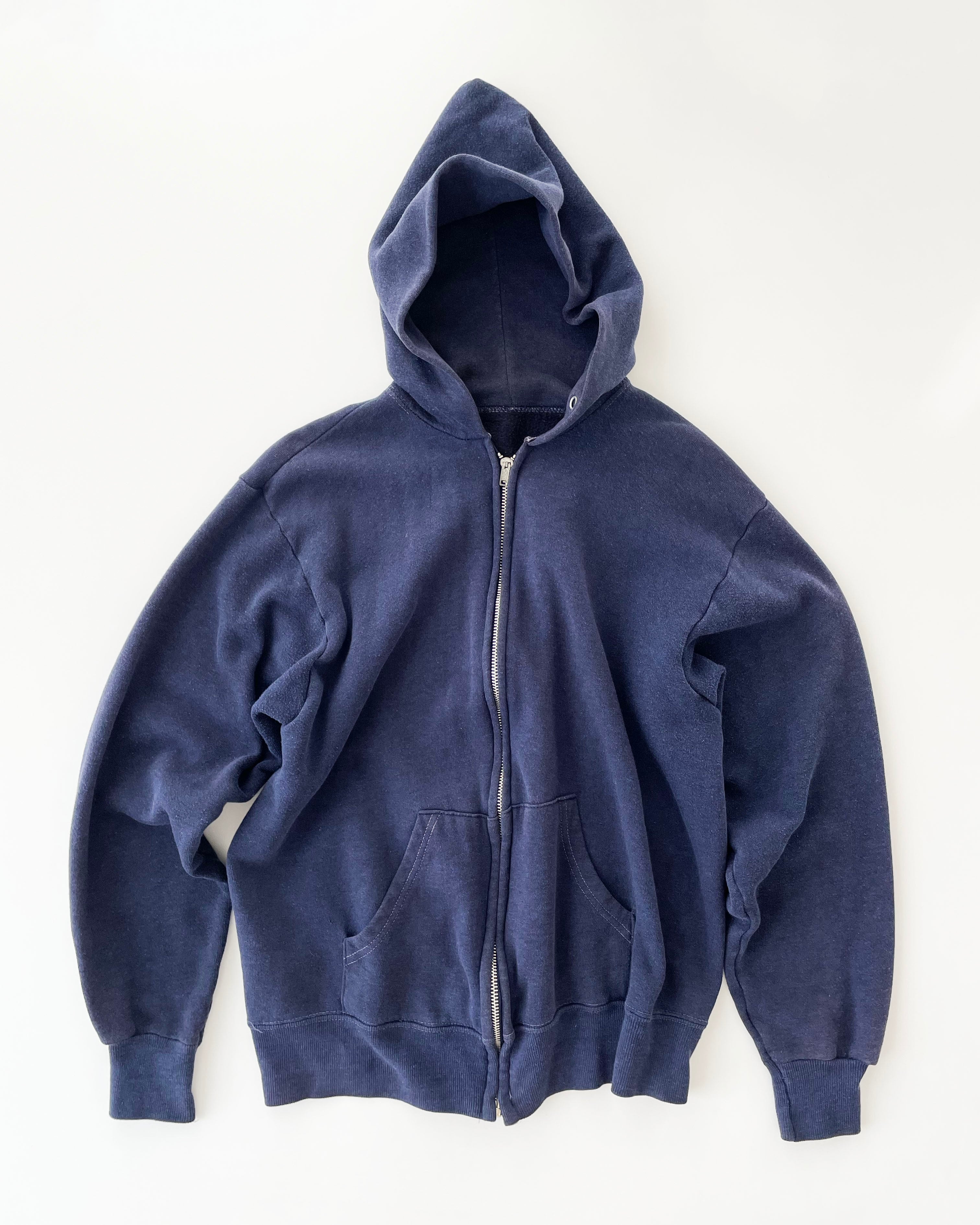 ネイビーカラー、シンプルな裏起毛ジップパーカ。
