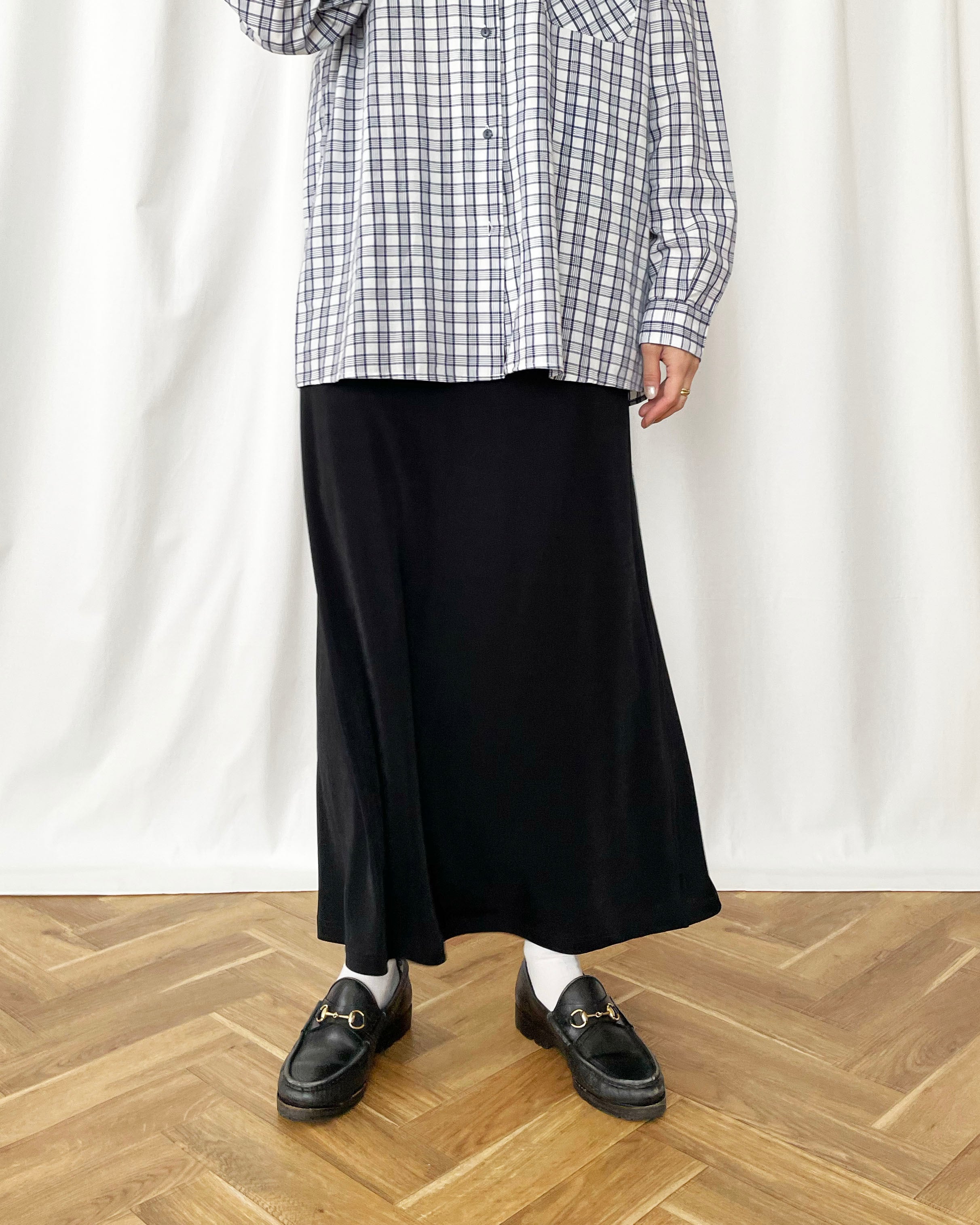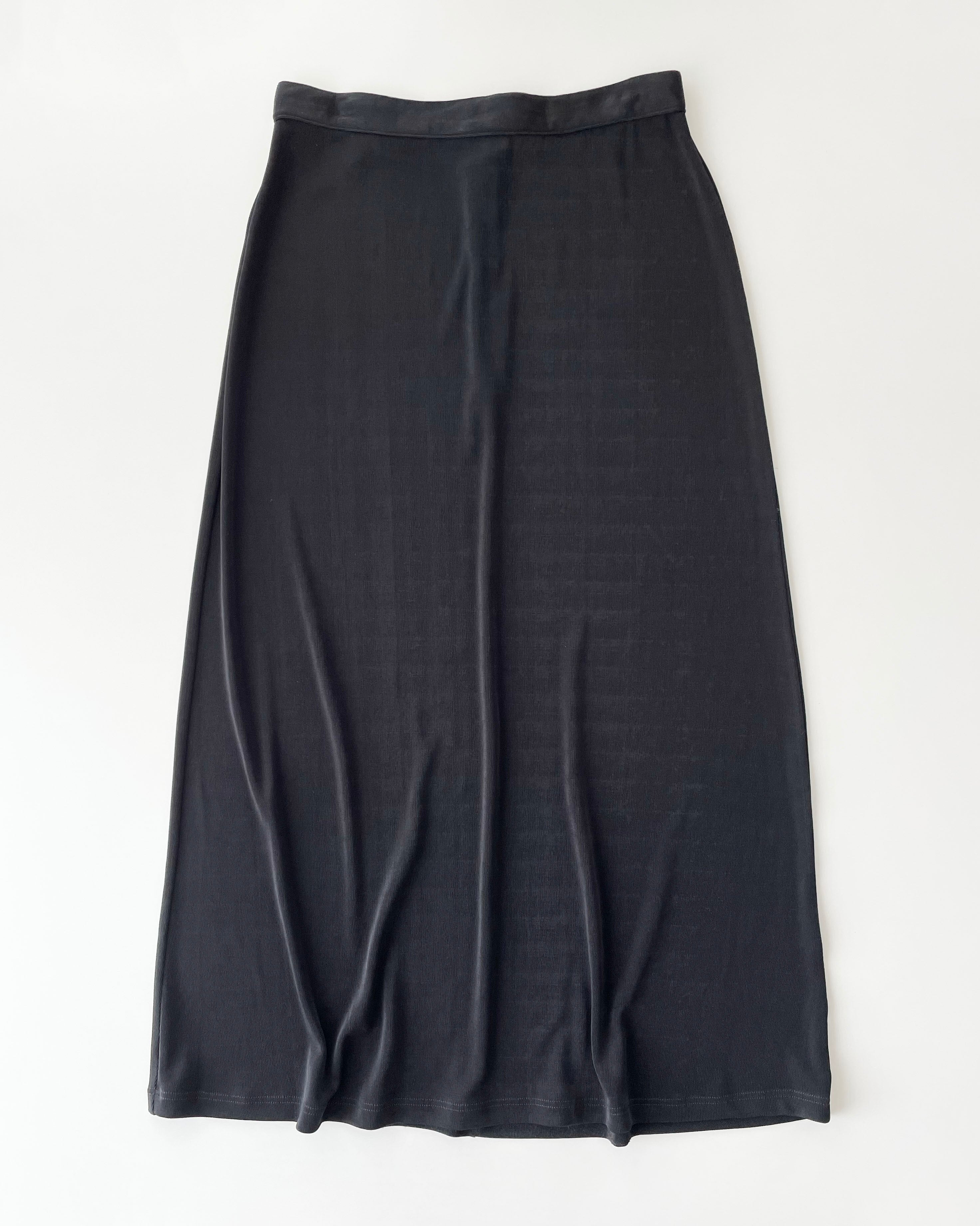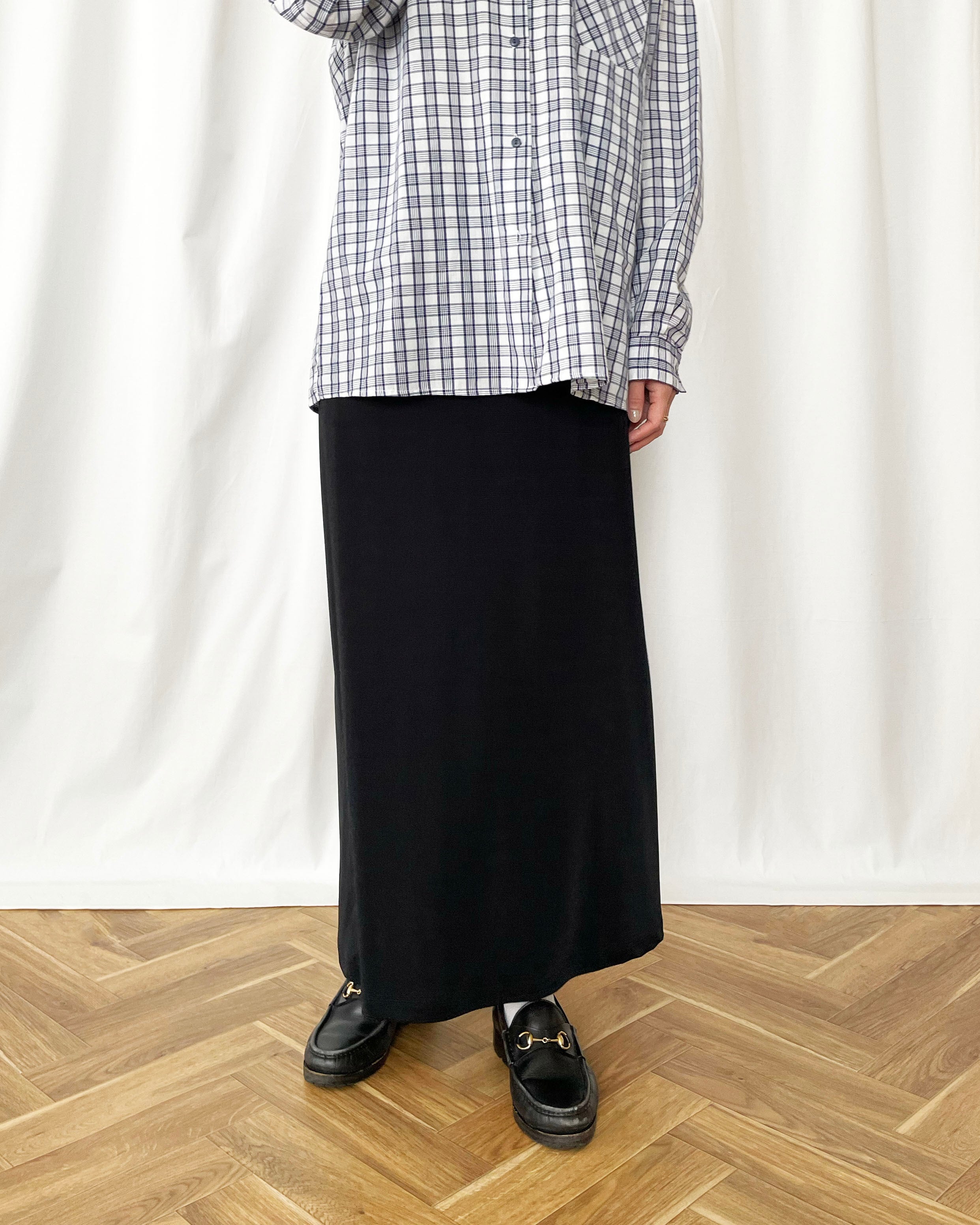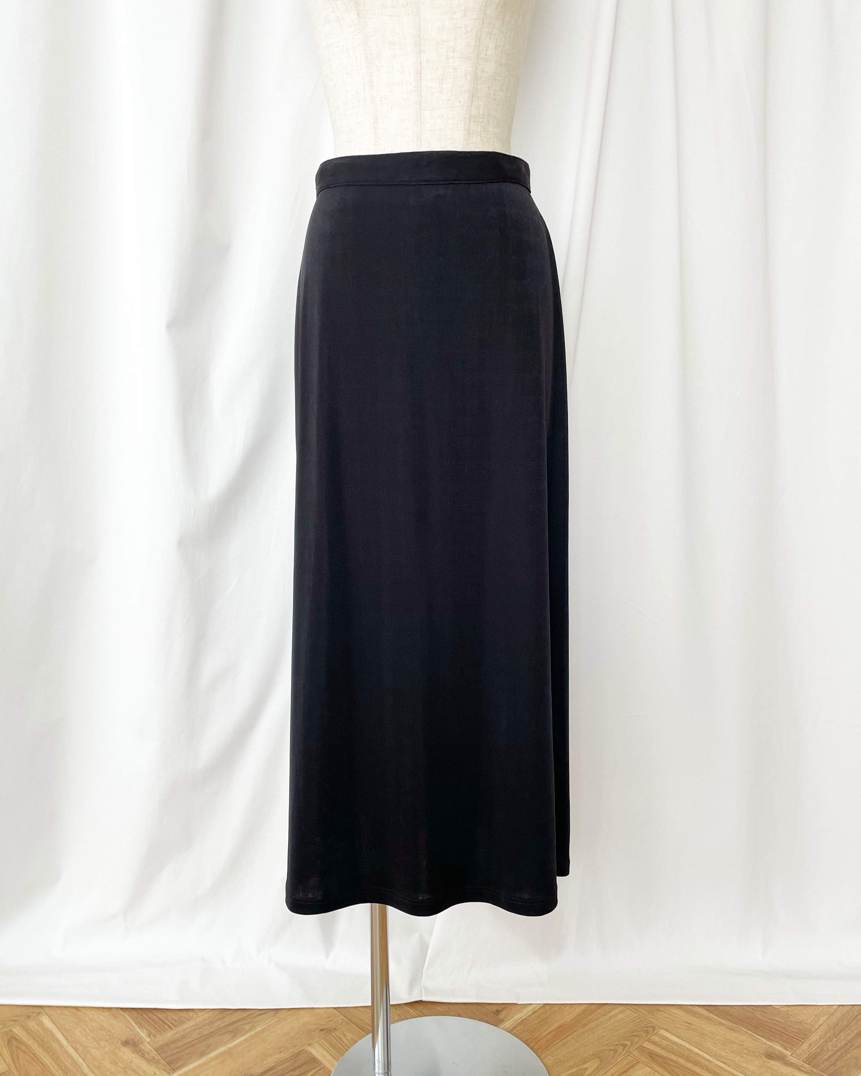 黒のテロっとした素材、シンプルなスカート。