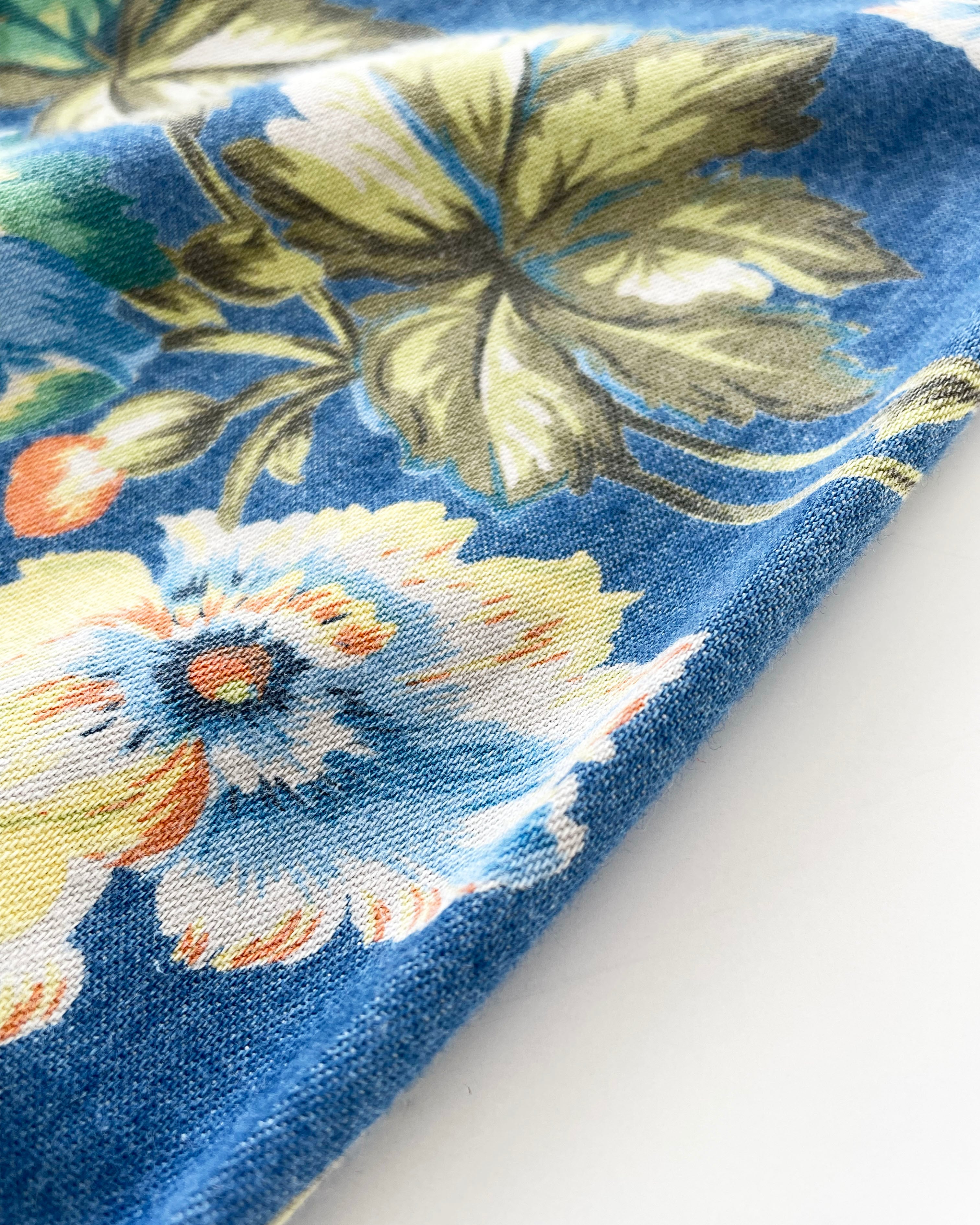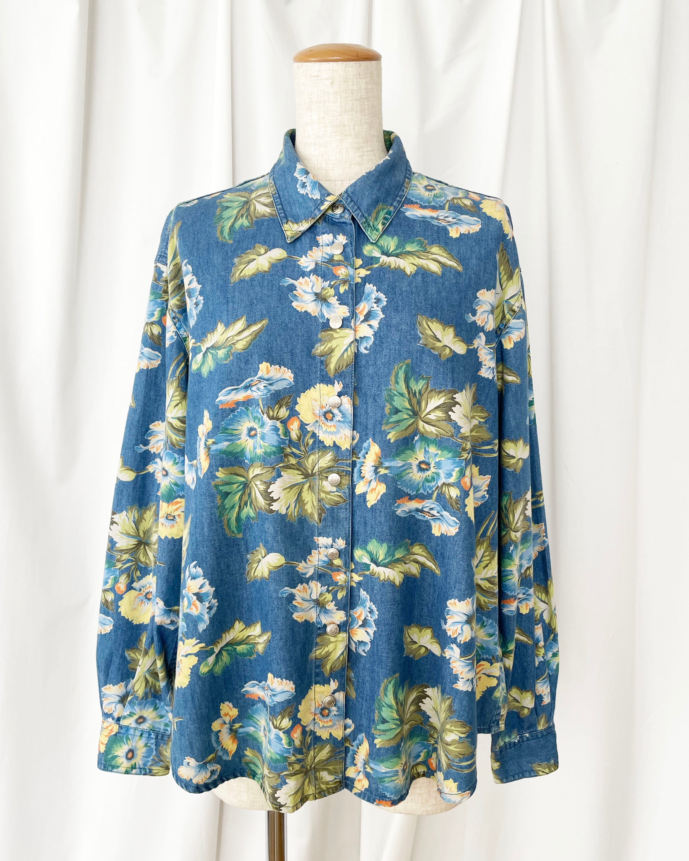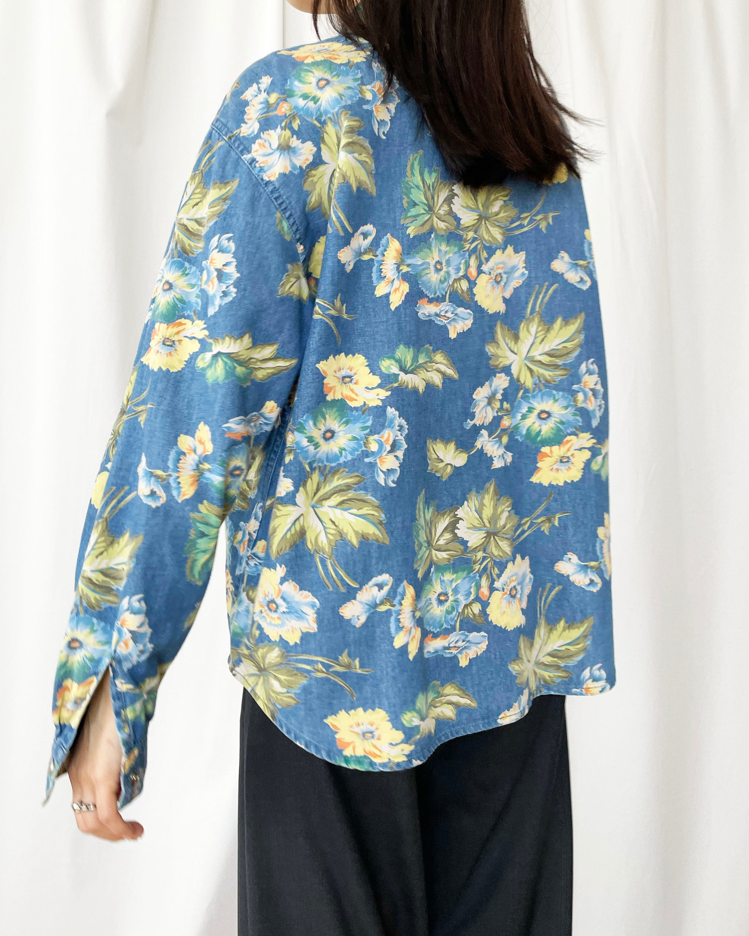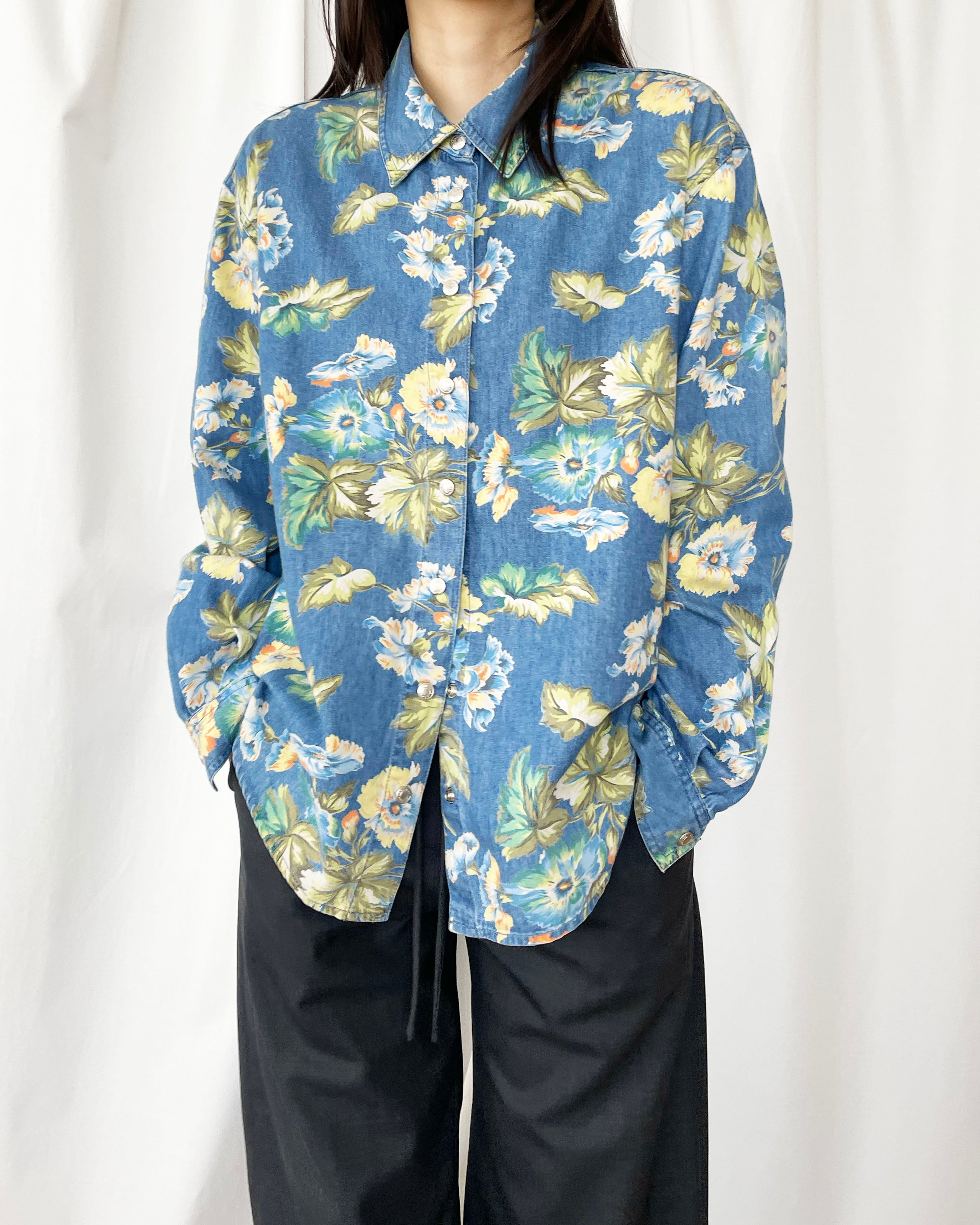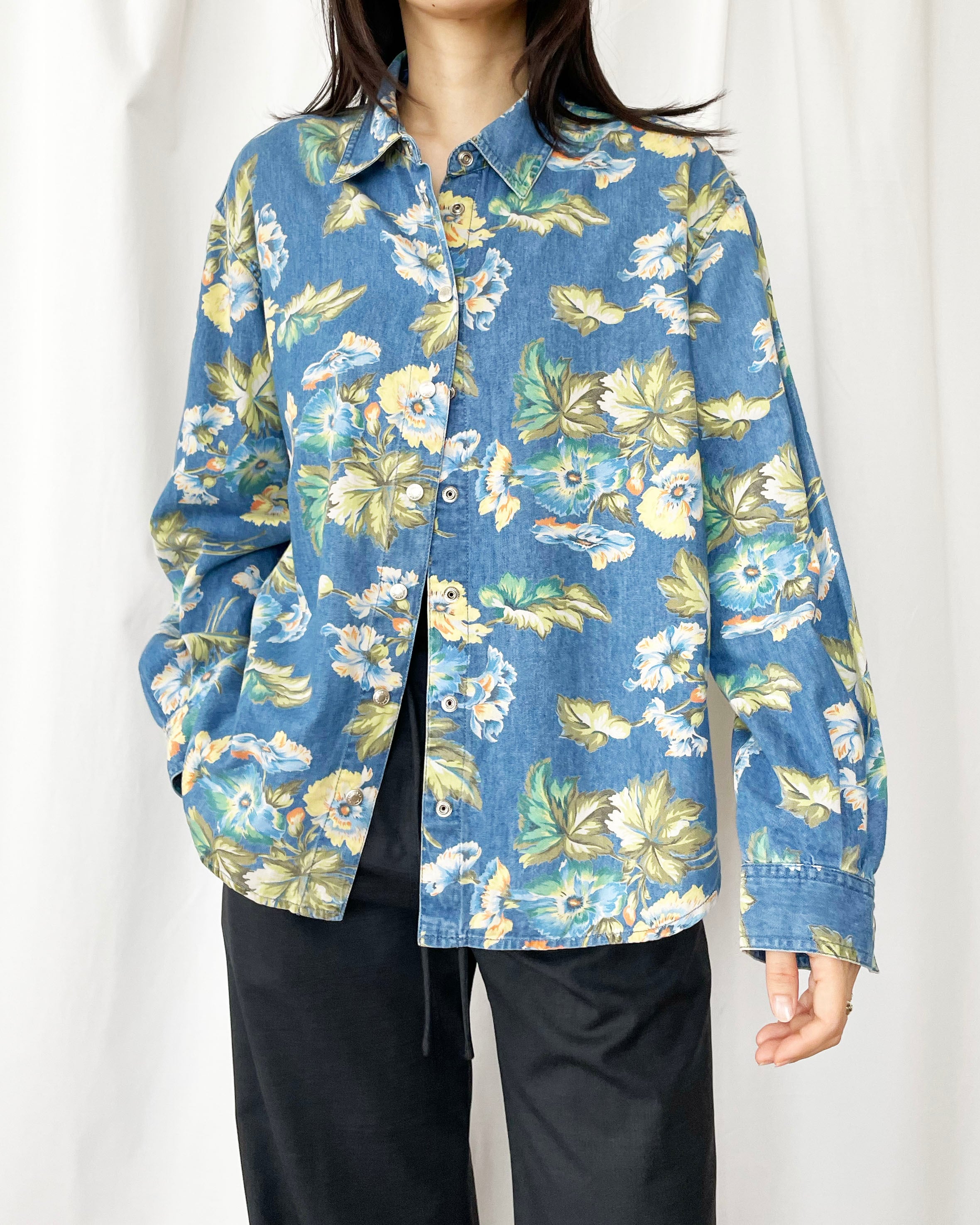 デニムシャツ×ボタニカルな花柄。